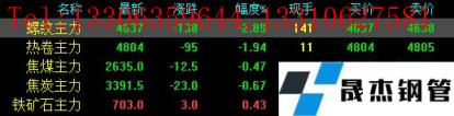 今日螺紋主力期貨跌138,收報(bào)4637,跌幅2.89%;熱卷主力跌95,收報(bào)4804,跌幅1.94%;焦煤主力跌12.5,收報(bào)2635,跌幅0.47%;焦炭主力跌23,收報(bào)3391.5,跌幅0.67%;鐵礦石主力漲3,收報(bào)703,漲幅0.43%。